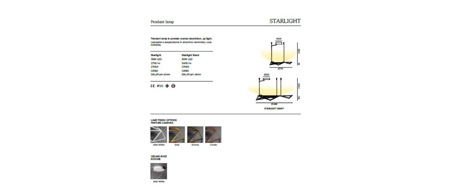 Κρεμαστό φωτιστικό οροφής Starlight με ιδιαίτερο design που προσομοιάζει το σχήμα του αστεριού και προσθέτει μια ξεχωριστή πινελιά σε κάθε χώρο. Διαθέσιμο σε διάφορετικές αποχρώσεις, μπορεί να χρησιμοποιηθεί με πολλούς τρόπους σε διαφορετικά περιβάλλοντα επιτρέποντάς σας να προσαρμόσετε την εμφάνιση του χώρου σας.