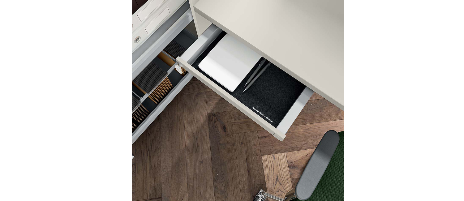 Για να διευκολύνει λίγο την καθημερινή εργασία, το Up&Up είναι εξοπλισμένο με αξεσουάρ, ώστε τα πάντα να είναι πάντα στο χέρι: το πρακτικό συρτάρι χαρτικών ολοκληρώνει τη σύνθεση με τις διακριτικές γραμμές του. το γραφείο μπορεί επίσης να εξοπλιστεί με έναν πύργο αποθήκευσης, ιδανικό για την κατακόρυφη αποθήκευση εγγράφων και φακέλων. Απόλυτη άνεση με το Up&Up.