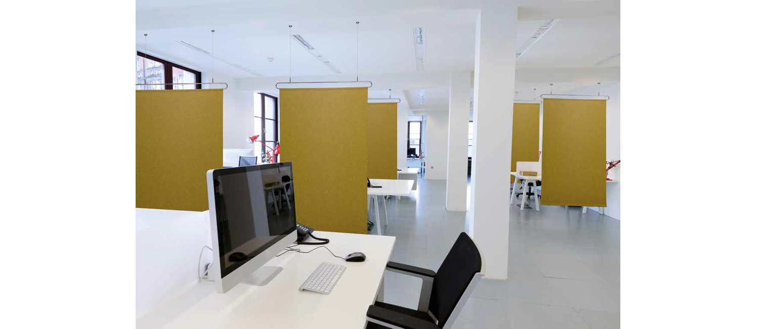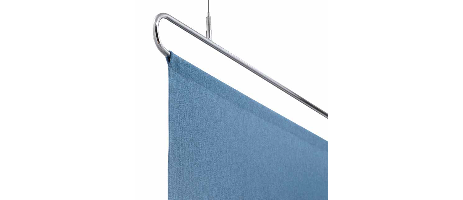 In Clasp wall and Clasp ceiling, the acoustic fabric Snowsound Fiber runs around simple steel buckles. The textile panel can be easily removed from the structure thanks to a hidden system in the upper edge, while the lower edge houses a chrome-plated steel rod fixed with two visible chrome-plated pins. Clasp can be hung from the ceiling or fixed to the wall. The fabric is supported by a chrome-plated metal frame, available in the wall version and on cables fastened to the ceiling with a height adjustment mechanism. The fabric slipcover is removable.