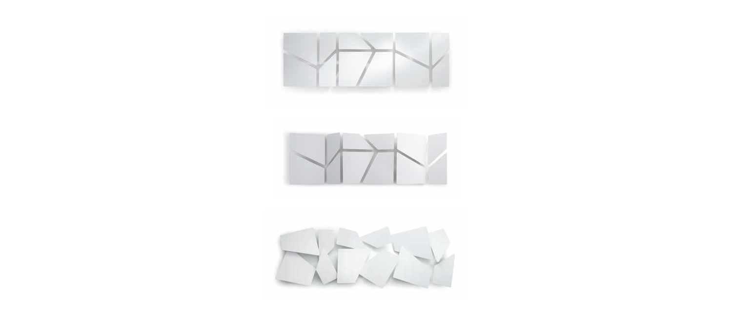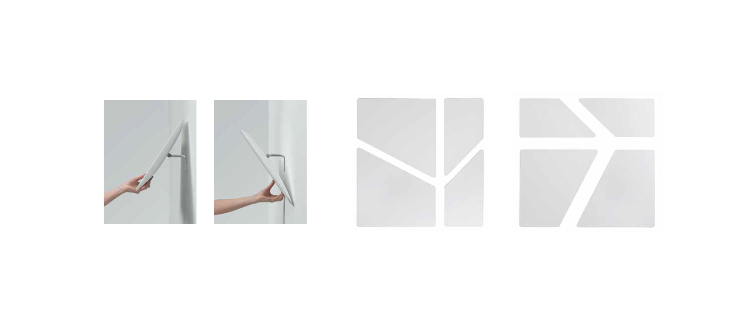 Sound-absorbing panels characterized by the perfectly planar front surface. The wall brackets are fitted with a rear metal hinge that can rotate and tilt the element.