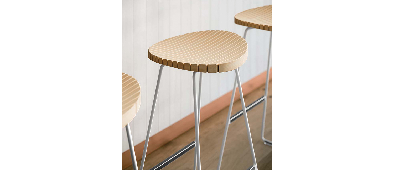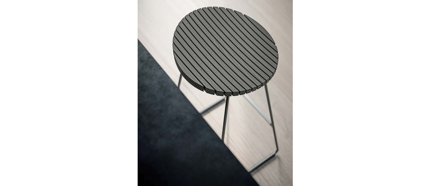 Εκλεπτυσμένο και ιδιαίτερο, το κάθισμα Clark αποτελείται από πολυάριθμα ξύλινα πηχάκια, τοποθετημένα δίπλα-δίπλα και διάσπαρτα με λεπτές σχισμές: μια λύση που δίνει σταθερότητα στο σκαμπό και κάνει την αισθητική δυναμική.