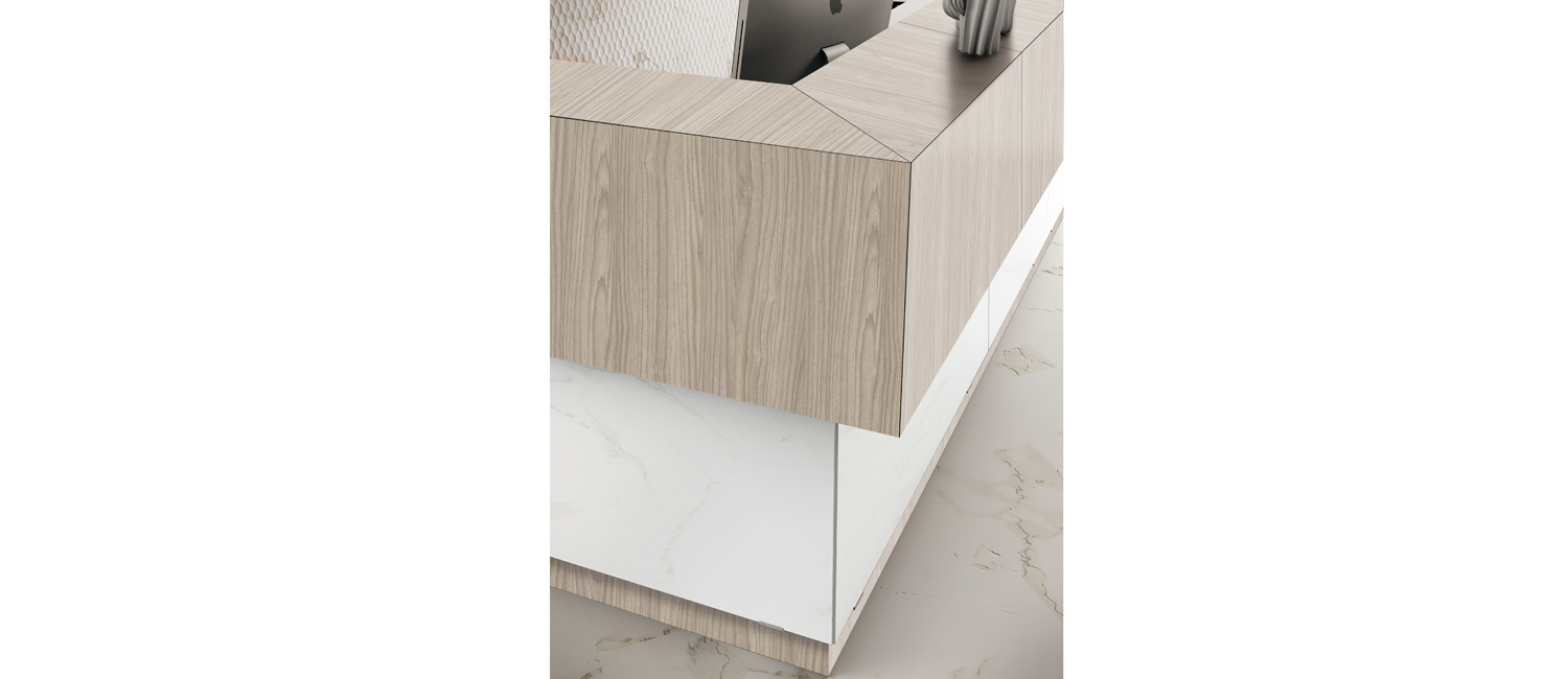 Οι λεπτομέρειες επεξεργασίας της μελαμίνης εξασφαλίζουν ένα διακριτικό χαρακτήρα στην Lodge και αναδεικνύουν την πολυμορφικότητα των επιμέρους στοιχείων που καθιστά τη Lodge ιδανική λύση για κάθε χώρο υποδοχής.